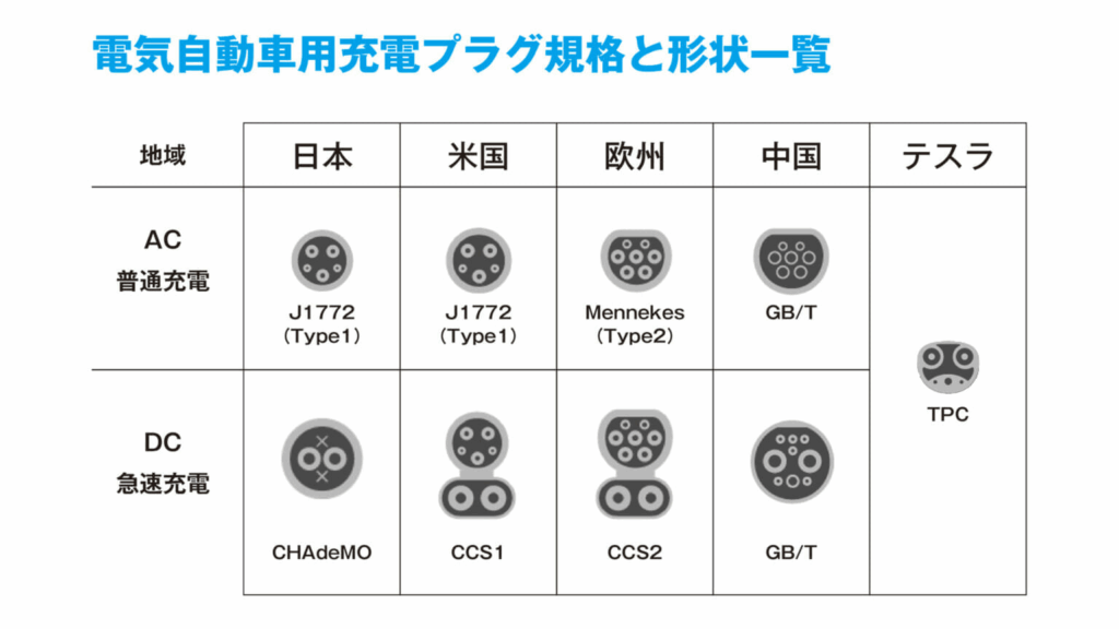 日本では「CHAdeMO」や「J1772」と呼ばれる規格が一般的ですが、